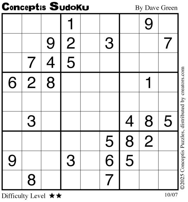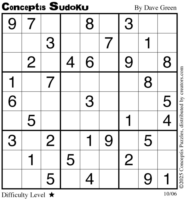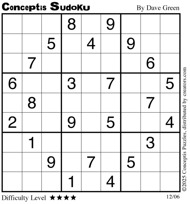 Each puzzle consists of a 9x9 grid containing given clues in various places. The object is to fill all empty squares so that the numbers 1 to 9 appear exactly once in each row, column and 3x3 box.
